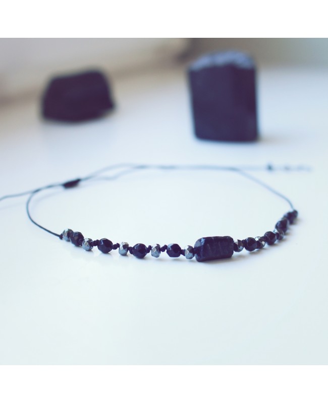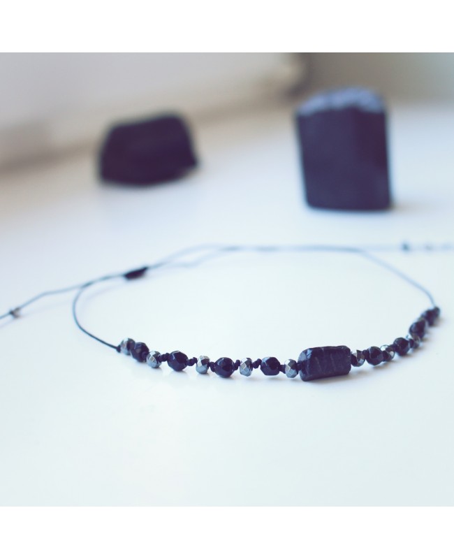 Das Armband besteht aus einem rohen Turmalin (Schörl), geschliffenen Turmalinen und funkelnden Hämatiten.