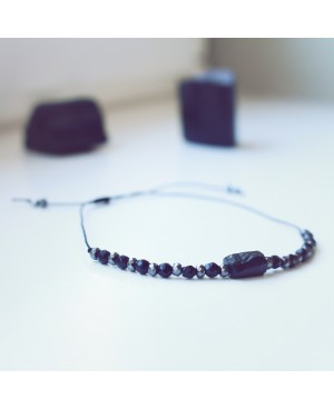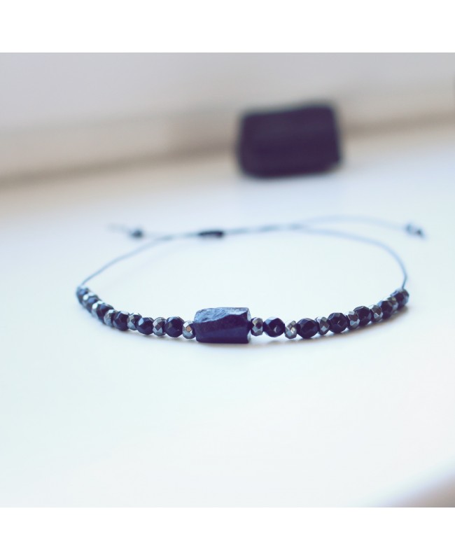 Das Armband besteht aus einem rohen Turmalin (Schörl), geschliffenen Turmalinen und funkelnden Hämatiten.