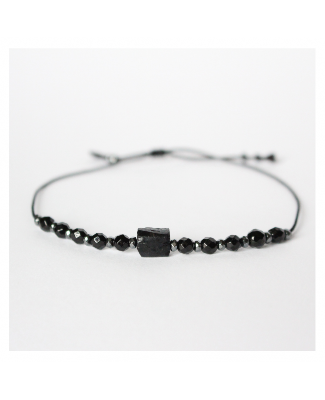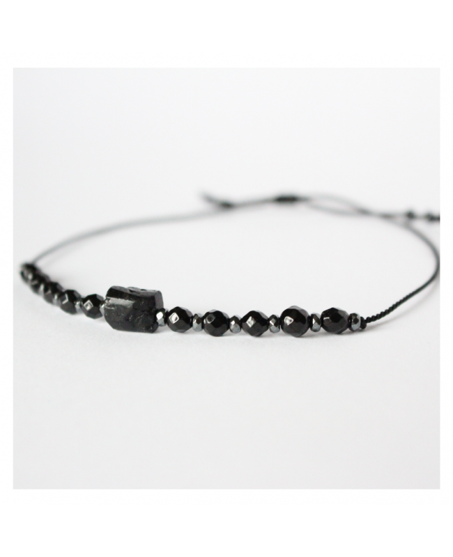 Das Armband besteht aus einem rohen Turmalin (Schörl), geschliffenen Turmalinen und funkelnden Hämatiten.