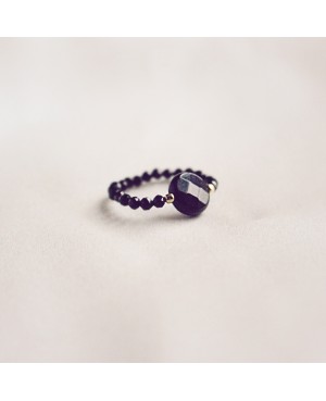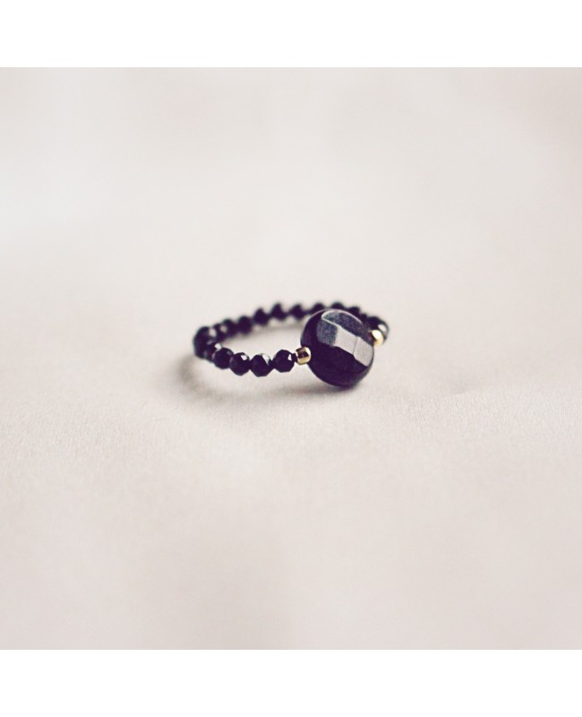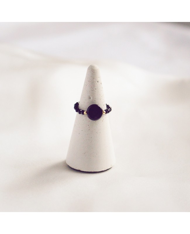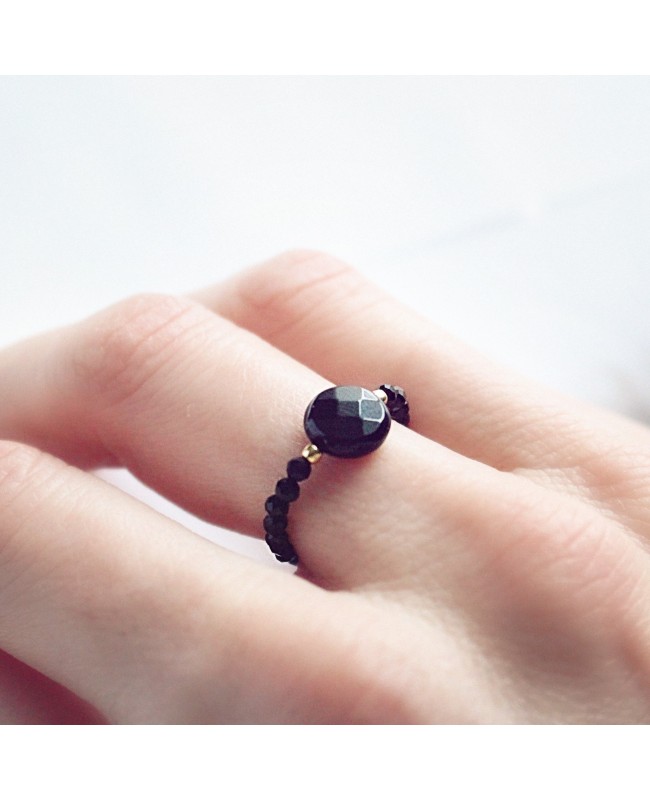 Elastischer Ring aus kleinen Onyx-Steinen (2mm), einem größeren Onyx (8mm) und 2 Kugeln aus 925-Silber.