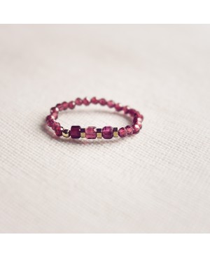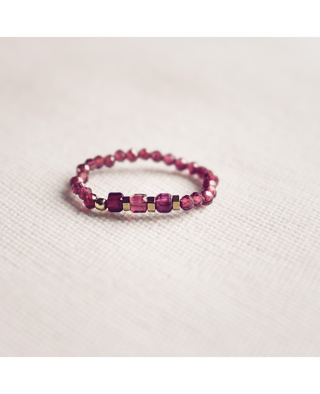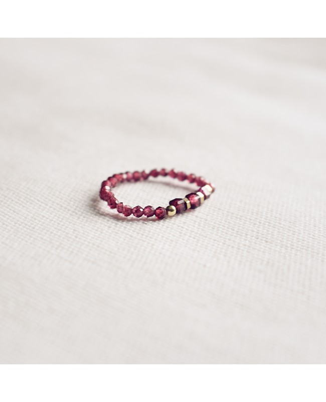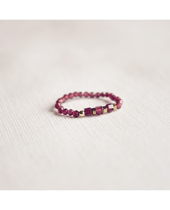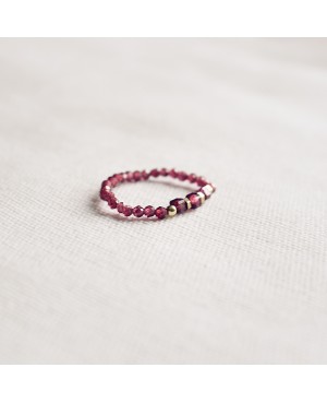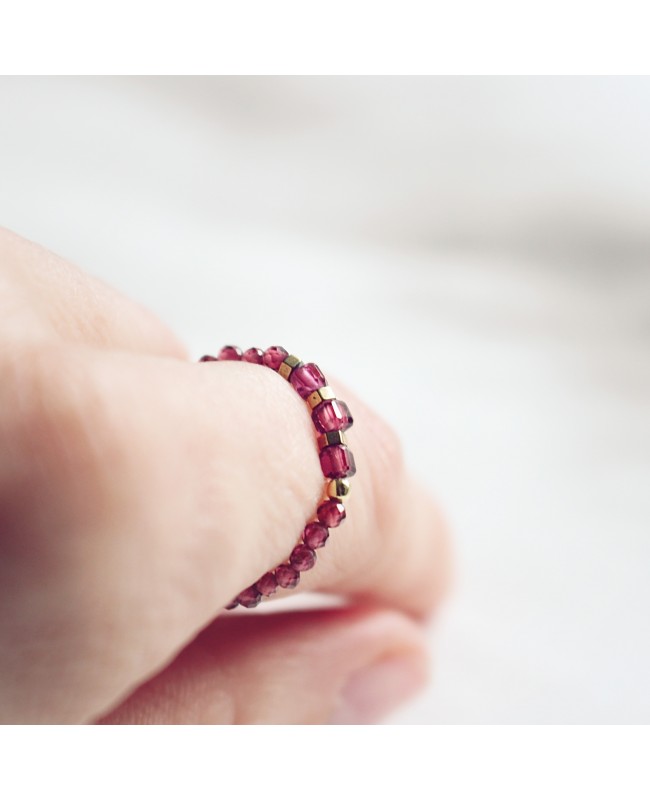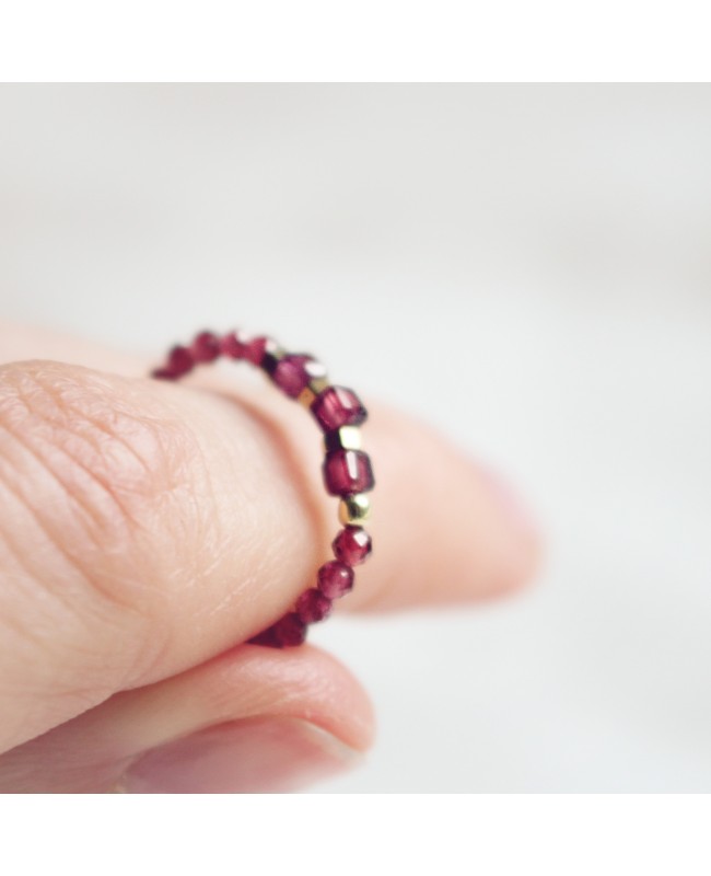 Elastischer Ring aus kleinen funkelnden Granaten und Hämatiten und einer vergoldeten oder silbernen Kugel aus 925-Silber.
