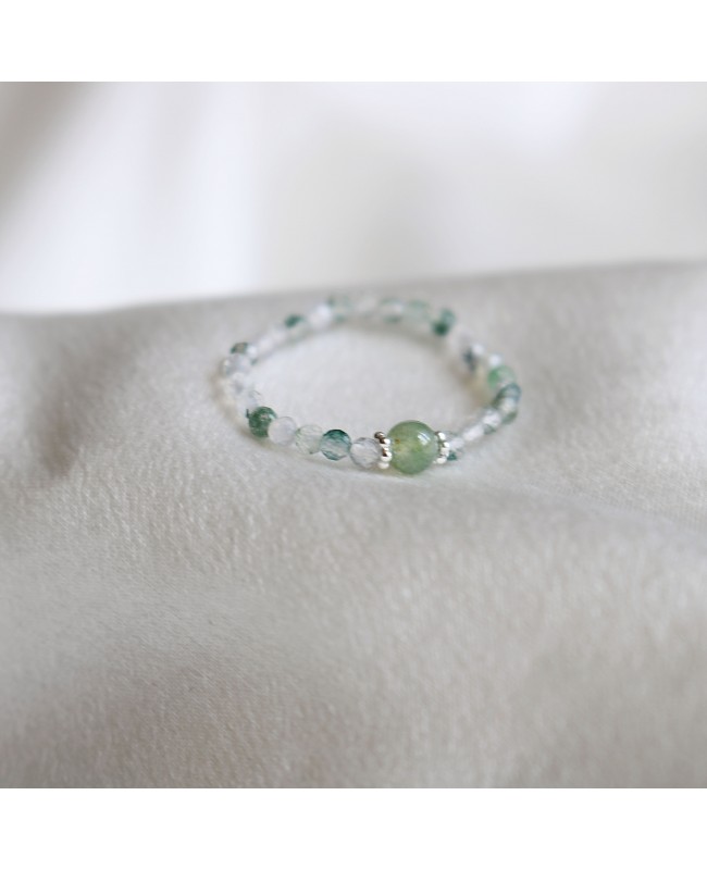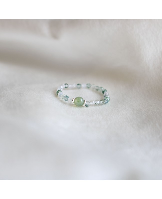 Elastischer Ring aus kleinen facettierten Moosachaten und einem größeren Moosachat in der Mitte sowie mit silbernen Akzenten aus 925-Silber.