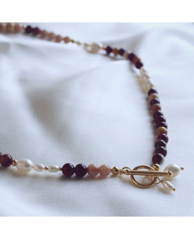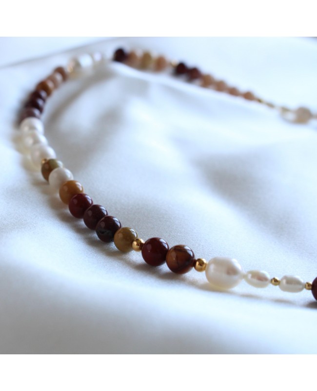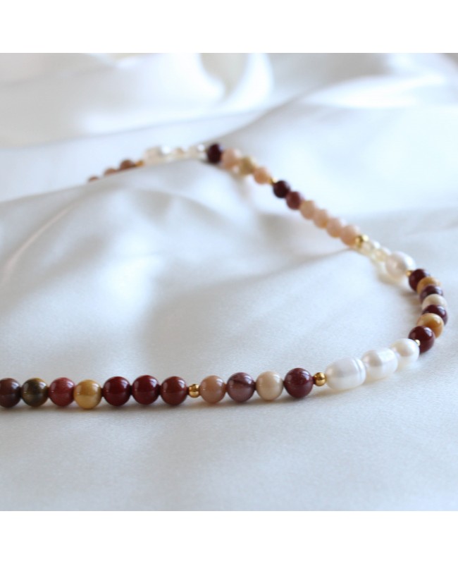 Halskette mit Mookait, Sonnenstein und Perlen sowie Kugeln aus 925-Silber.