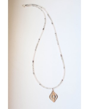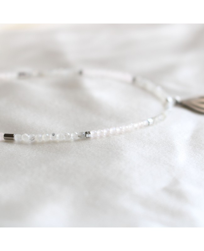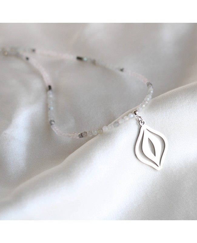 Eine feminine Halskette aus Labradorit & Rosenquarz mit einem Yoni-Anhänger (aus Edelstahl).