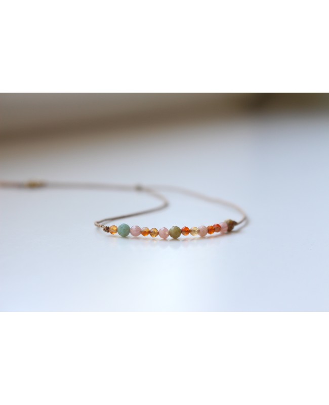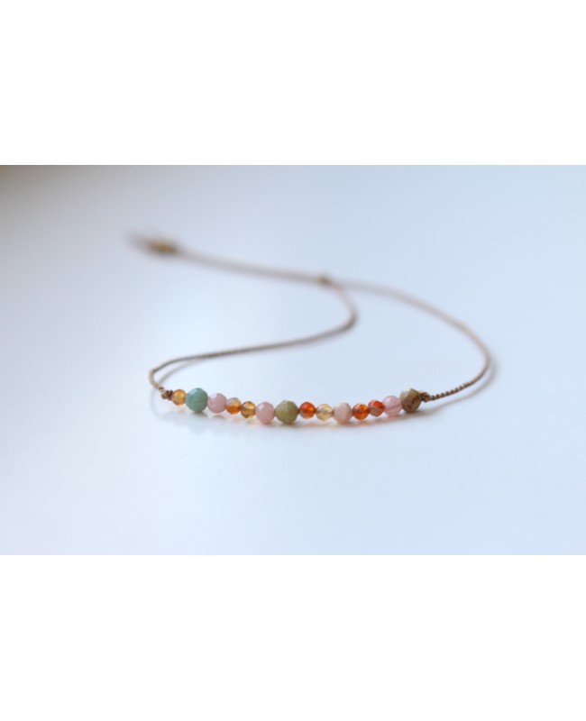Das Armband zieren Karneol, Rhodonit, Chrysokoll.